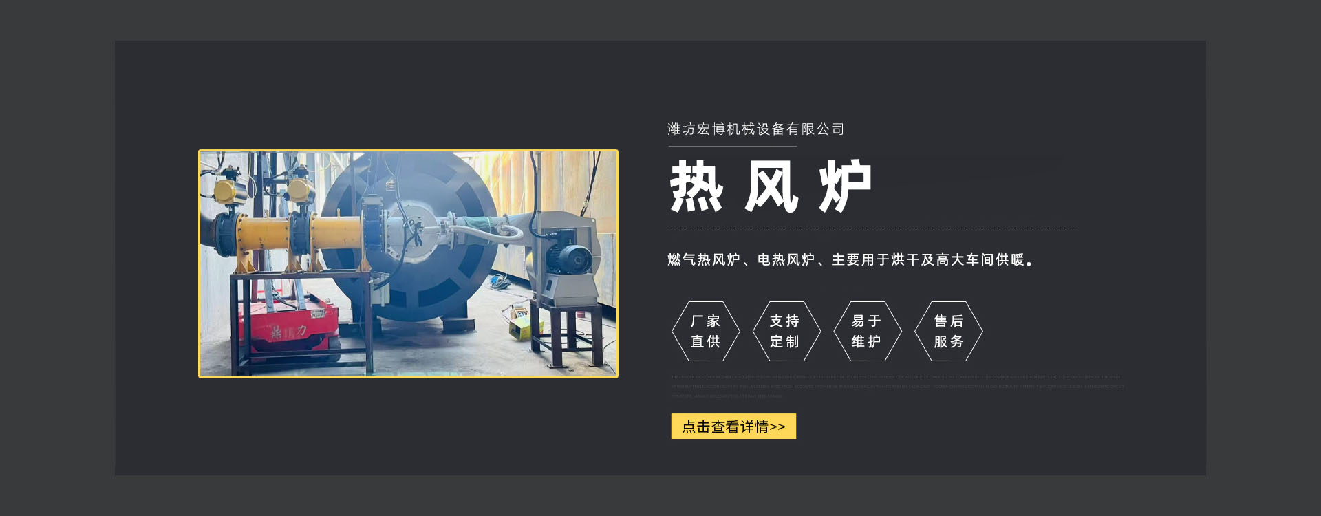 濰坊宏博機(jī)械設(shè)(shè)備有限公司是從事熱風(fēng)爐、烘干設(shè)(shè)備、供暖設(shè)(shè)備的研發(fā)(fā)、設(shè)(shè)計(jì)、制造和服務(wù)(wù)于一體的實(shí)體企業(yè)(yè)。長(zhǎng)期以來,企業(yè)(yè)以市場(chǎng)的發(fā)(fā)展和客戶的需求為導(dǎo)(dǎo)向,集多年的生產(chǎn)(chǎn)技術(shù)(shù)與經(jīng)(jīng)驗(yàn)為一體,不斷開發(fā)(fā)和優(yōu)(yōu)良產(chǎn)(chǎn)品。